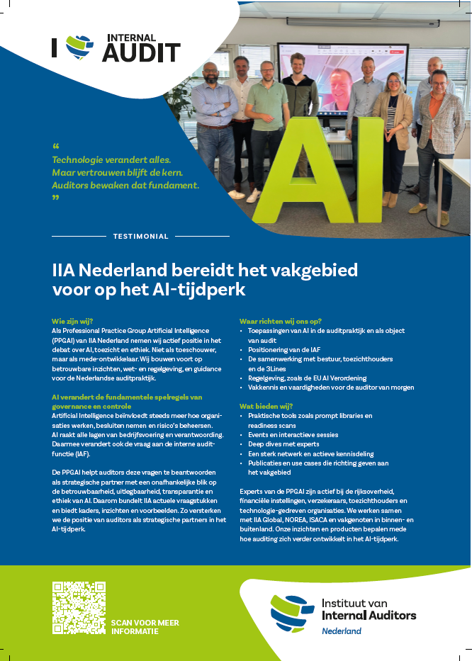 Artificial Intelligence is niet langer een technische innovatie aan de zijlijn. Het vormt de kern van hoe organisaties zich ontwikkelen, risico’s beheersen en besluiten nemen. Deze ontwikkelingen stellen nieuwe eisen aan bestuur, risicobeheersing en dus ook internal audit. Als beroepsvereniging anticipeert IIA Nederland actief op deze transformatie.